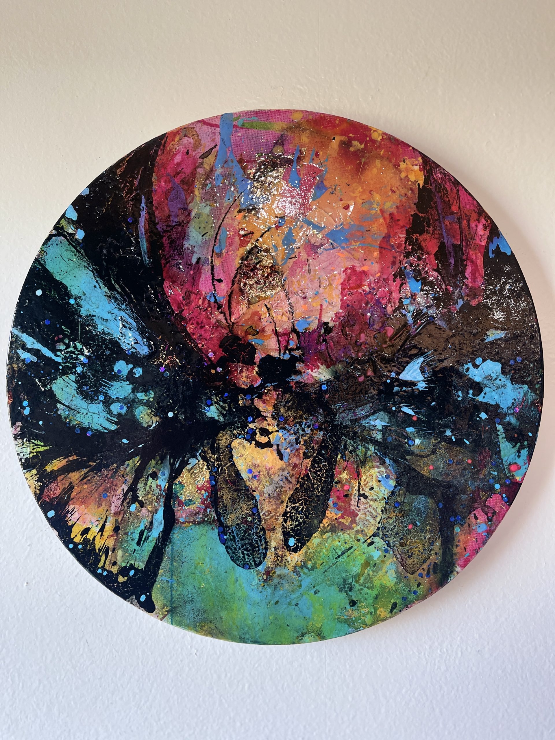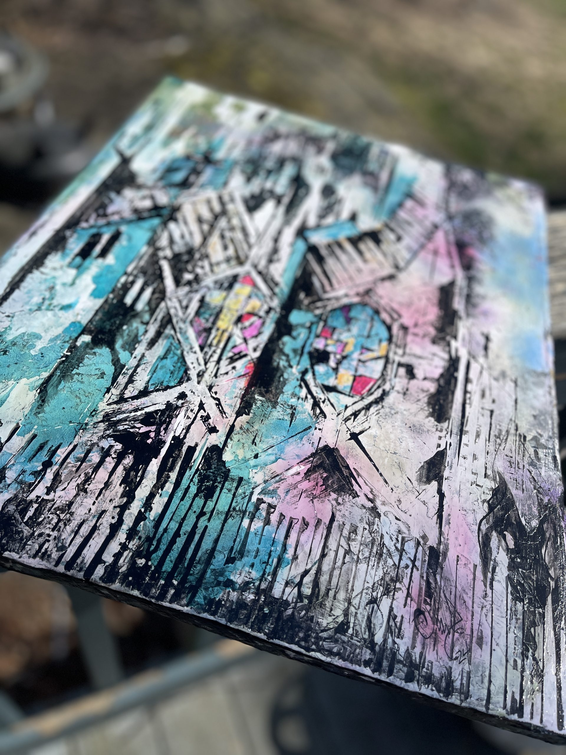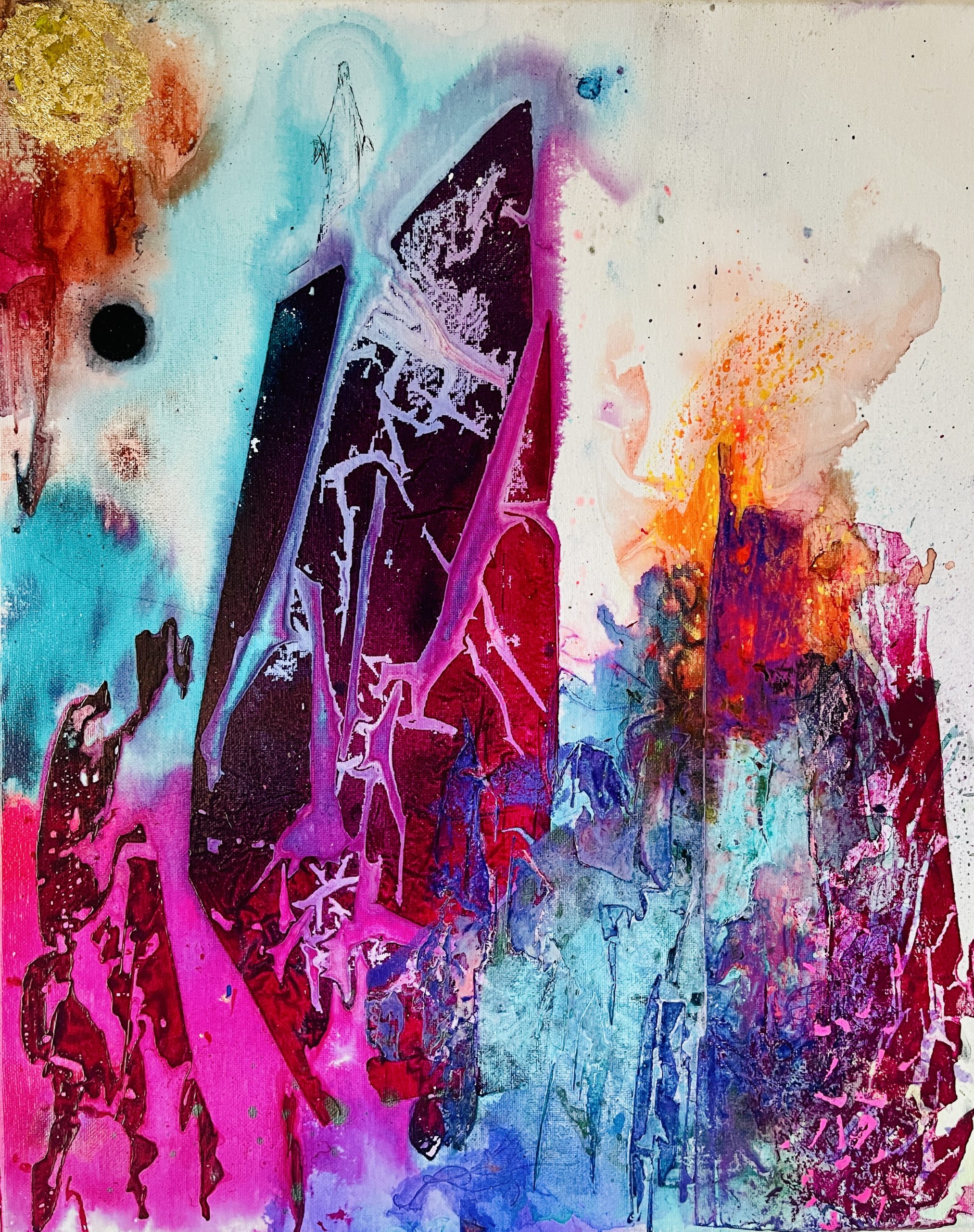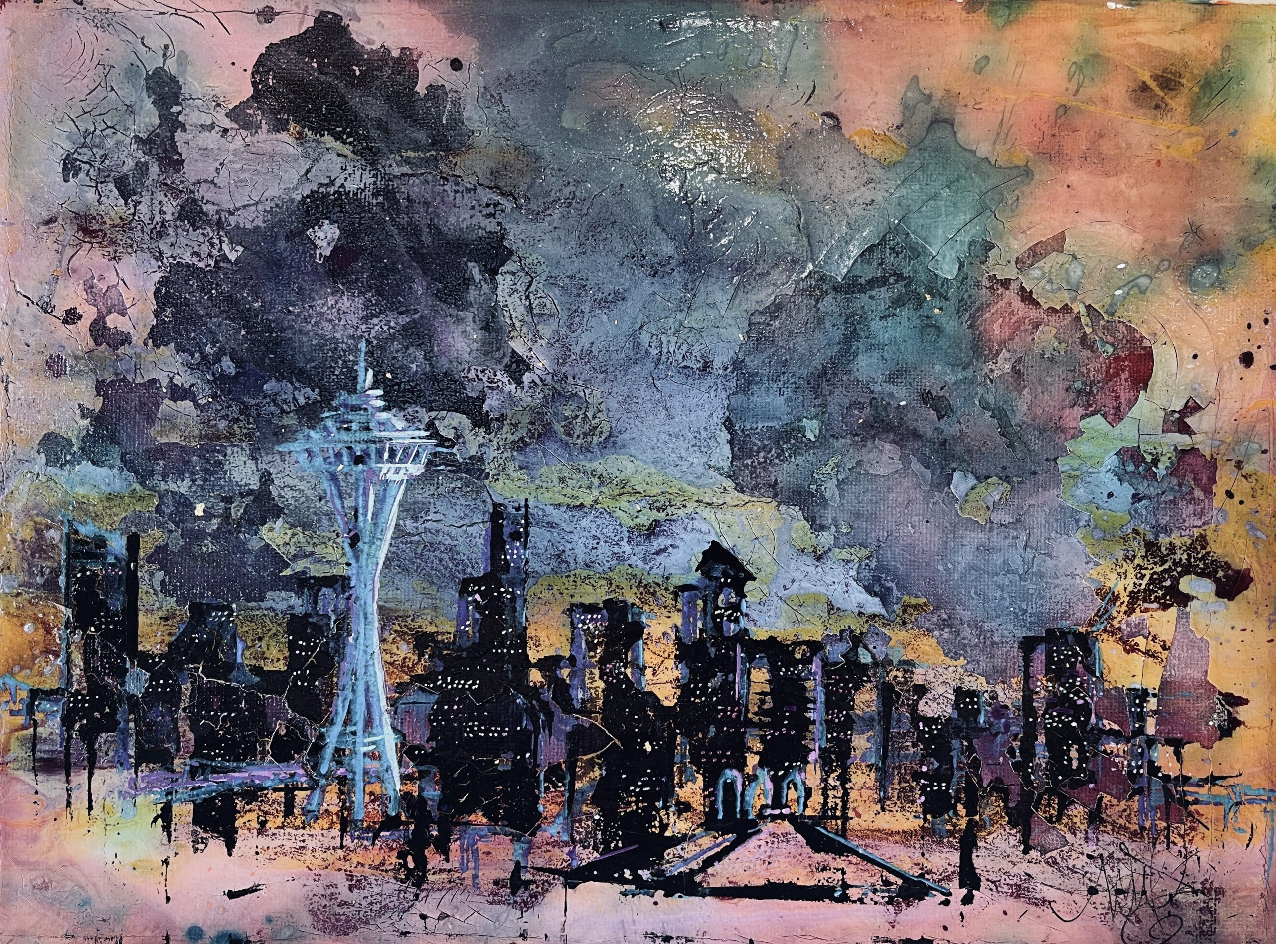 SOLD! This painting captures the essence of the Seattle skyline with a bold and atmospheric interpretation. The iconic Space Needle stands prominently amid a cityscape silhouetted against a dramatic, abstract sky. The textured background swirls with deep blues, fiery oranges, and moody purples, evoking the ever-changing weather and energy of the Pacific Northwest. The combination of fluid color blending and controlled linework gives the piece a striking balance between chaos and structure, making it both dynamic and captivating.