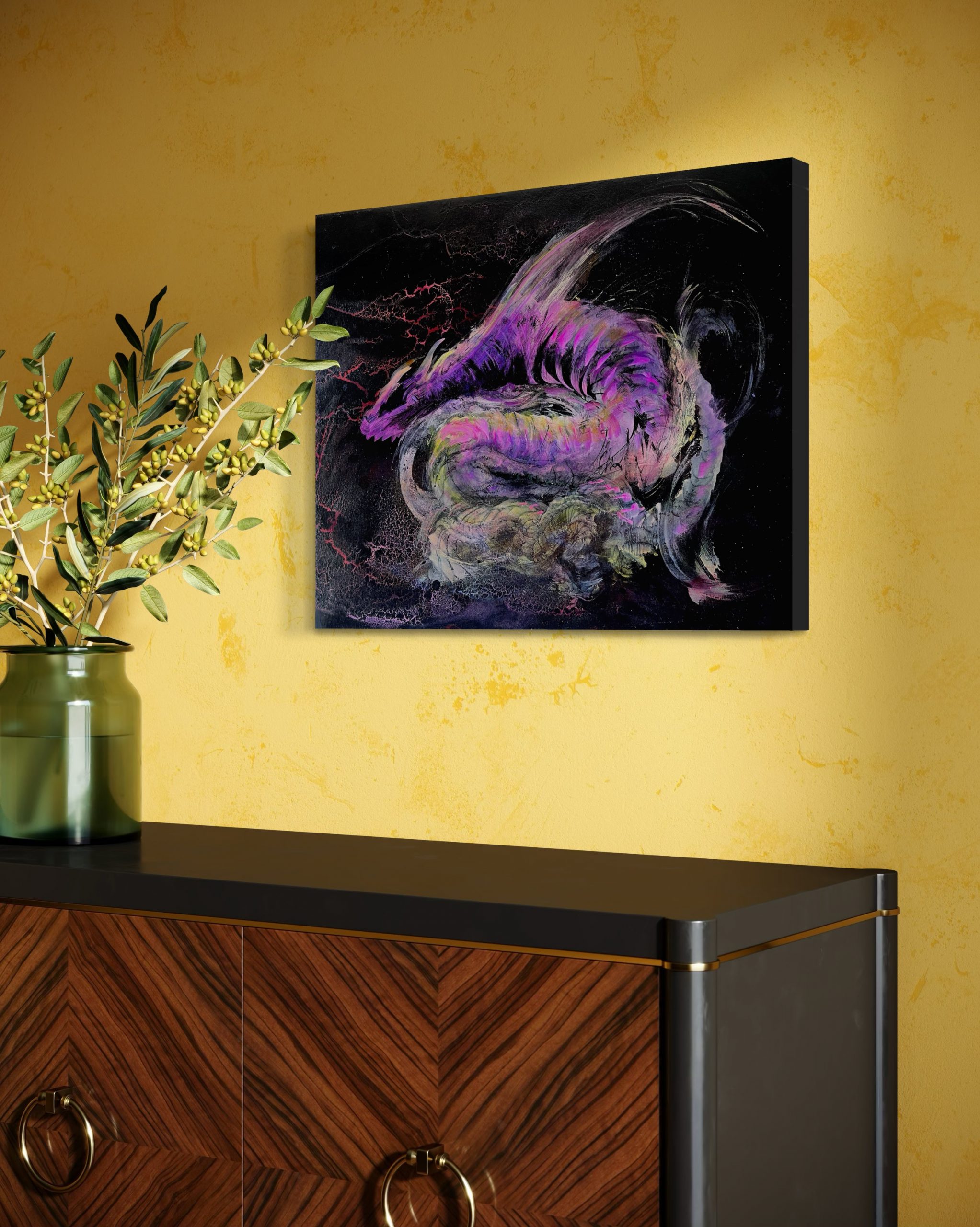 A fusion of raw energy and dreamlike serenity, Ethereal Slumber captures the mystique of a celestial dragon resting in the void. Swirling hues of deep purples, magentas, and yellow breathe life into the creature, evoking a sense of cosmic power intertwined with more than one creature. The textured background, veined with intricate fractal patterns, adds depth and movement, as if the dragon itself is woven from the fabric of the universe.