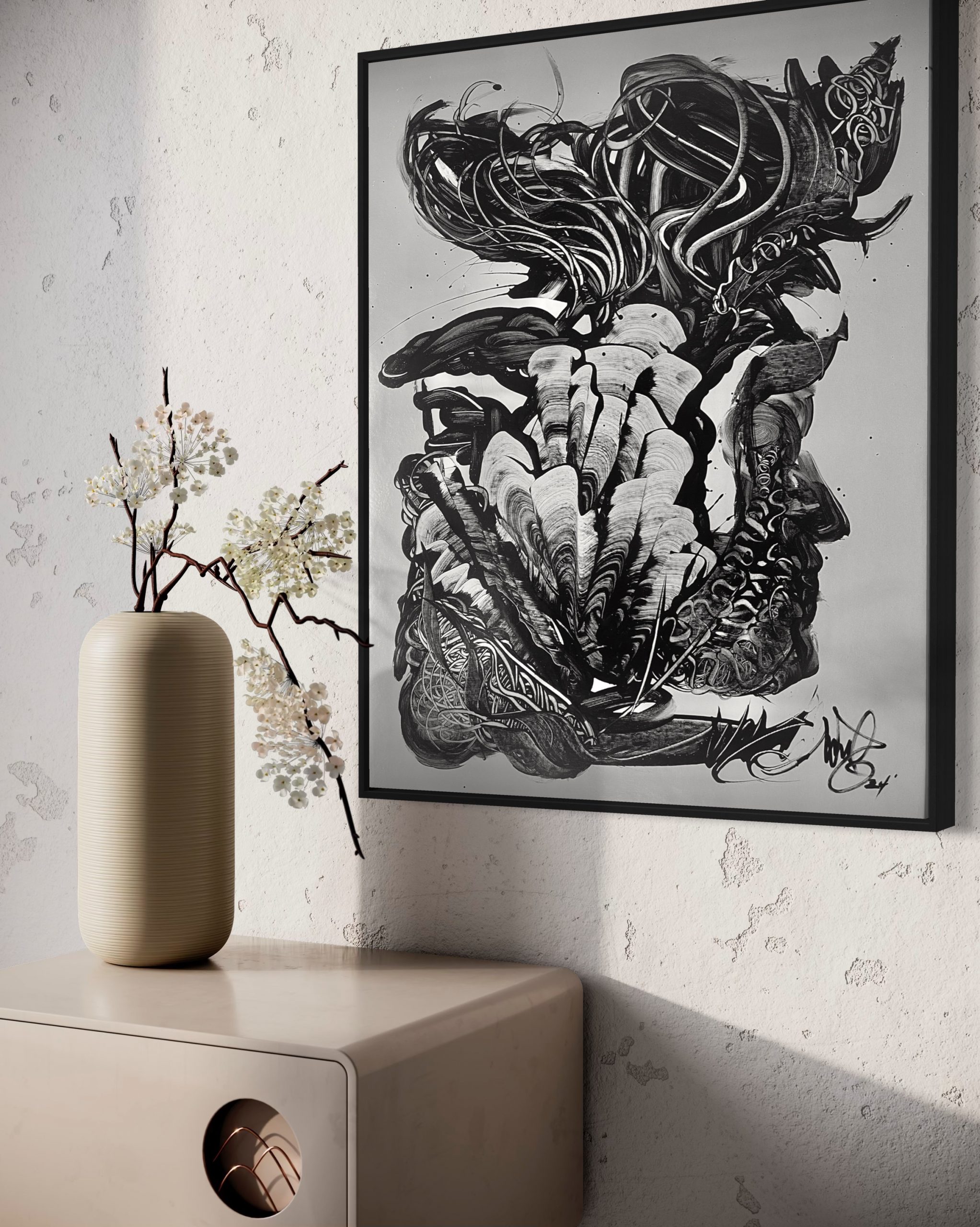 This striking black-and-white abstract piece commands attention with its bold, dynamic strokes and intricate circular patterns, evoking the motion and precision of a futuristic spacecraft in flight. The sharp, angular forms suggest propulsion and movement, while the layered textures and sweeping arcs create a sense of controlled chaos, like an otherworldly vessel cutting through space and time. A fusion of structure and spontaneity, this artwork blends raw energy with calculated design, making it a powerful statement piece in a modern, minimalist setting.
