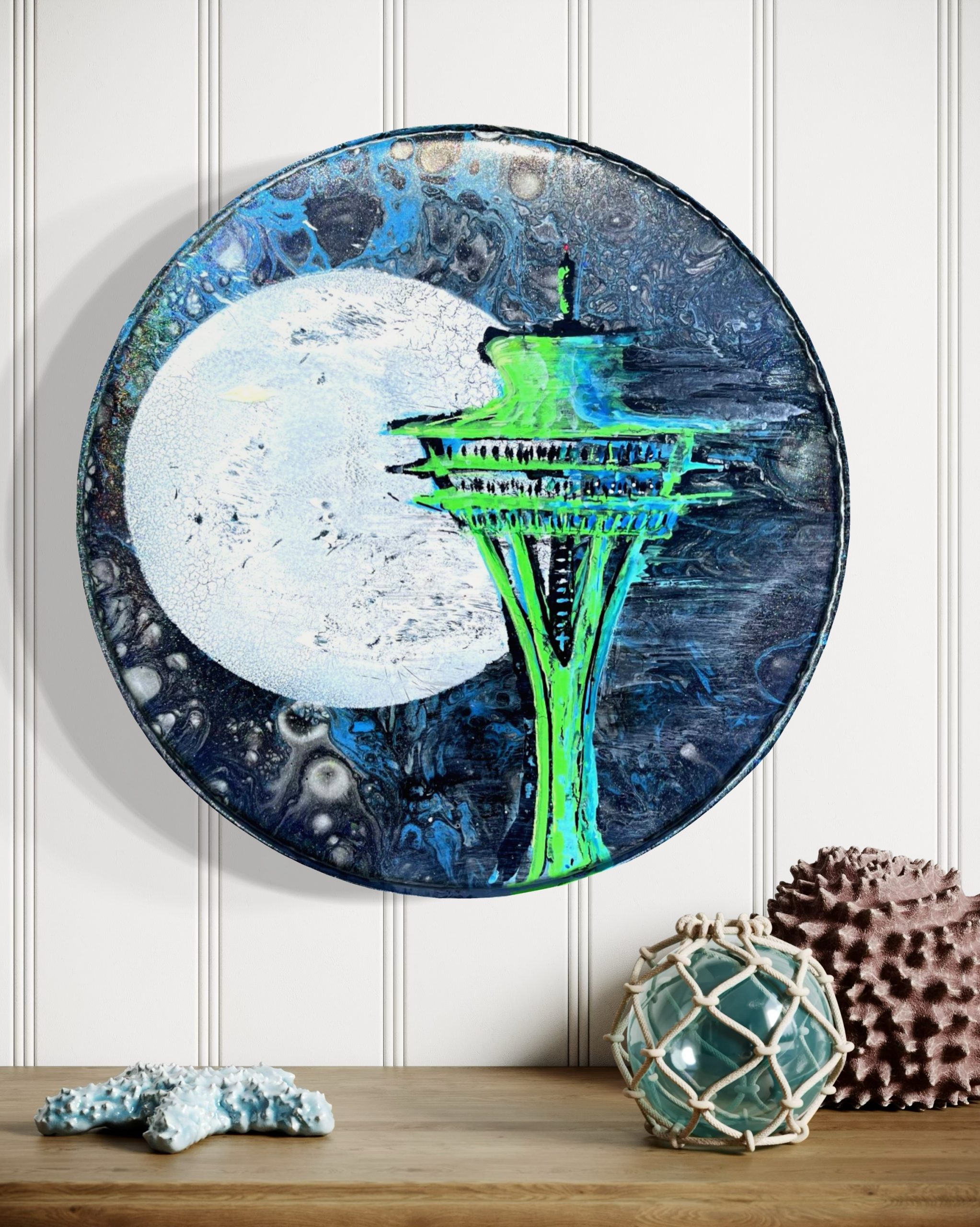 The Space Needle, bathed in an electrifying green glow, stands tall against a vast, textured moon, evoking both the city’s futuristic energy and its deep connection to the night sky. The swirling, marbled background hints at a celestial expanse, blending music, art, and the Pacific Northwests signature atmosphere into one striking composition. Painted on a used drumhead, it carries the rhythm of past performances, transformed into a visual symphony.